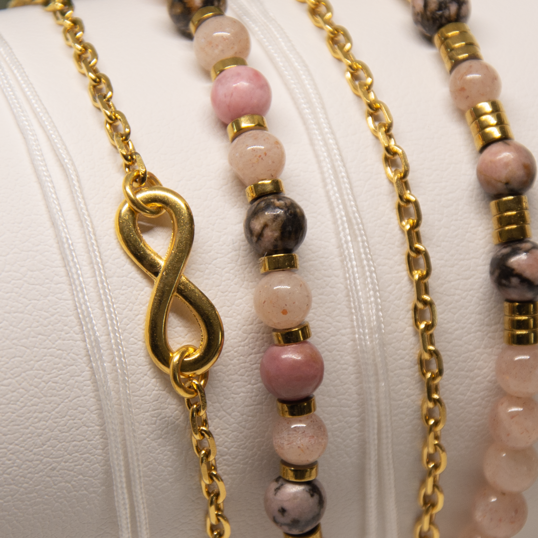 Exprimez votre douceur et votre passion avec notre bracelet en pierre de lune et rhodonite. Chaque pierre est sélectionnée pour sa beauté naturelle et ses propriétés énergétiques apaisantes. La combinaison de ces deux pierres crée un équilibre subtil entre l’amour et la vitalité. Ce bracelet incarne l’élégance et la féminité. Portez le pour une touche de glamour au quotidien ou pour illuminer vos occasions spéciales avec une énergie positive et rayonnante.