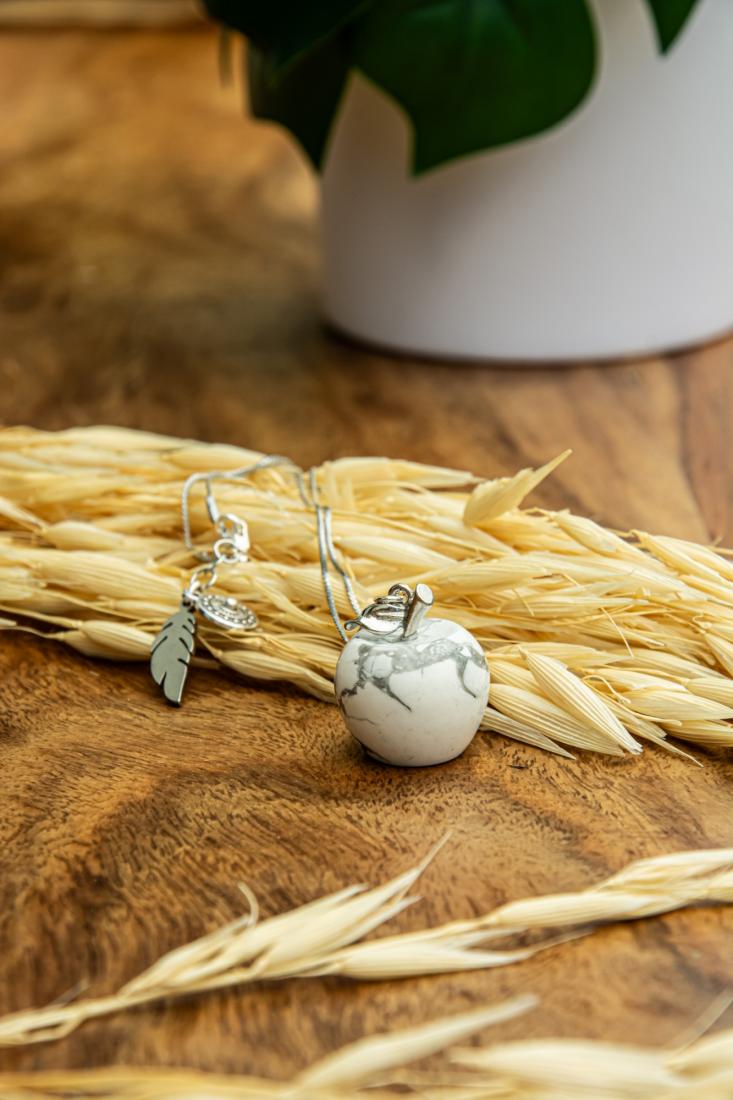 La pièce maîtresse de ce collier est une superbe pomme sculptée dans de la howlite de haute qualité. La howlite, avec sa couleur blanche marbrée de veines grises, offre un look intemporel et apaisant qui complète parfaitement toute tenue.